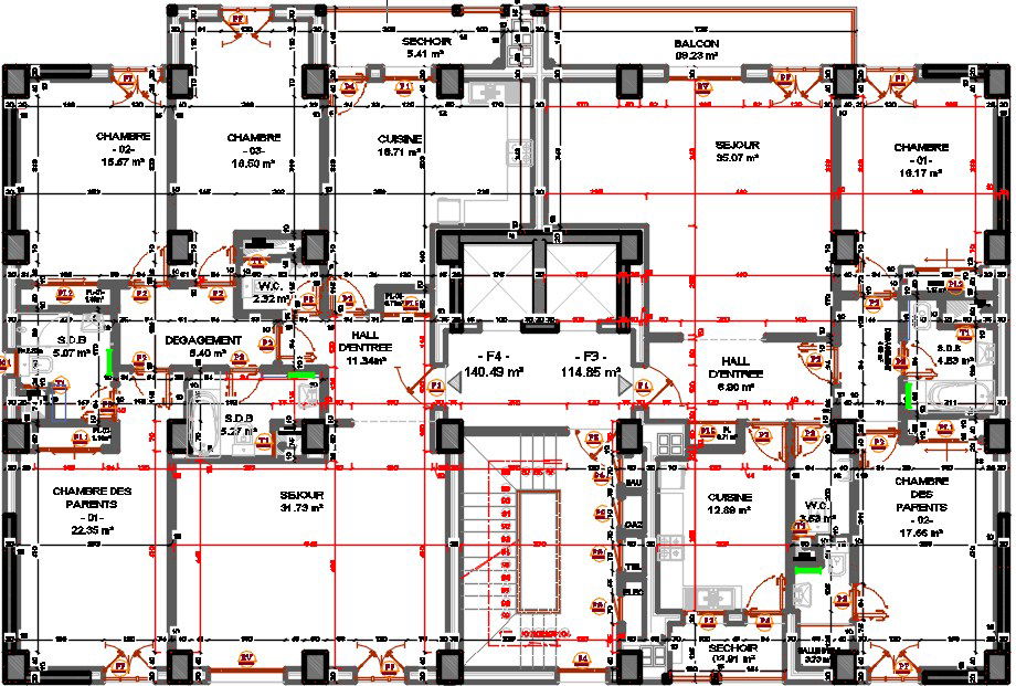 23x15m Block A2 apartment 4th floor plan design is given in this 2D DWG drawing model. On this floor, two houses are available. The area of each room is mentioned in the m2. Lifts are available for the two houses. This is a 3bhk and 1bhk house plan. On the first house, the living room, balcony, master bedroom with attached toilet, kid’s room with attached toilet, guest room, kitchen, and common bathrooms are available. In the second house 2 bedrooms are available. The living room, balcony, master bedroom with attached toilet, kid’s room with attached toilet, kitchen, and common bathrooms are available. For more details download the AutoCAD drawing file from our Cadbull website.