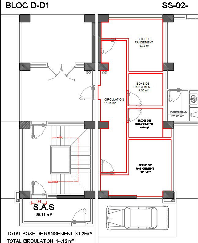 10x14m storage box area with car parking is given in this CAD drawing. A dressing area and bathroom is provided. The total area of the box storage is 31.28m2 and the total circulation area is 14.16m2. Totally 4 box arrangement area is provided, 1 car parking is provided, and 1 circulation area is provided. For more details download the AutoCAD drawing file from our Cadbull website.