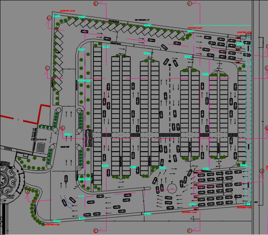 The castle parking lot detail drawing is given in this CAD model. This drawing is given with a detailed view of the parking lot with directions. Entrance, exit, drop off, and pick up areas are mentioned. Pedestrians are providing required places. For more detail download the AutoCAD drawing file from our cadbull website.