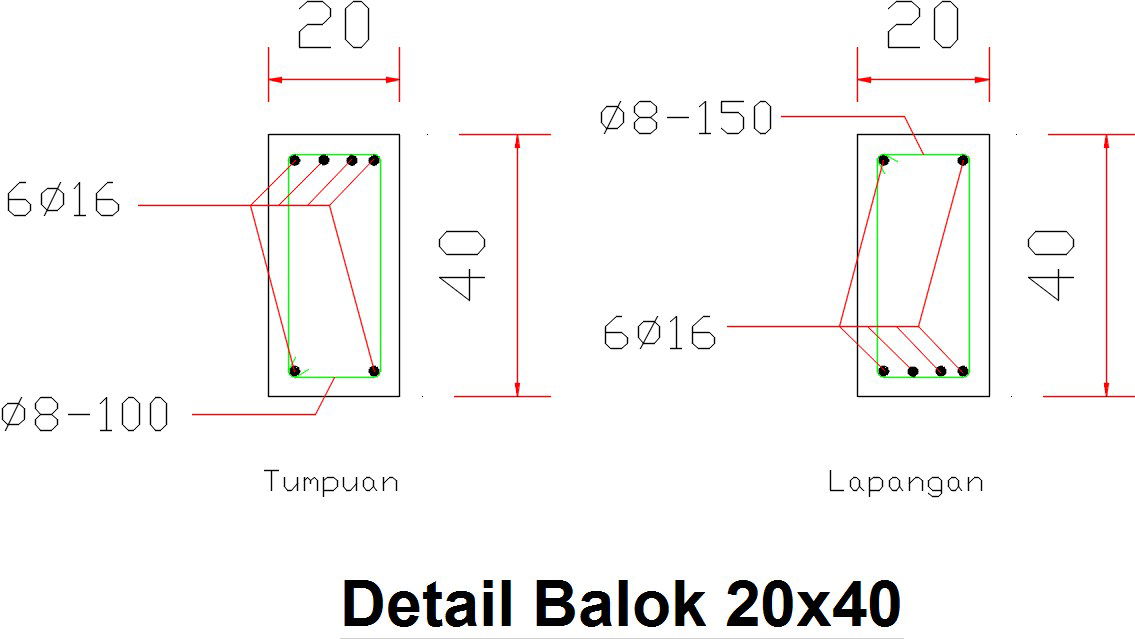 20x40cm theme park column cross section with reinforcing detail drawing is given. At the top, 4 bars are provided. At the bottom, 2 bars are provided. At the top, 6 numbers of 16mm diameter rod is provided. At the bottom, 8mm diameter with 100mm spacing is provided. For more details download the AutoCAD drawing file from our Cadbull website.