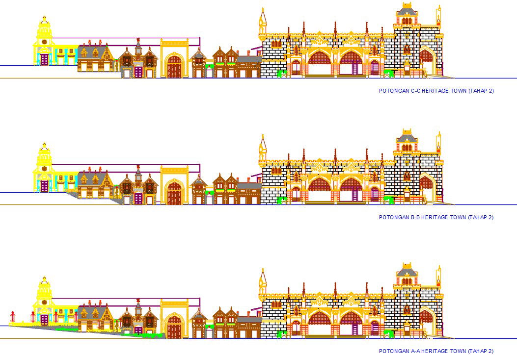 42x40m theme park heritage town building front elevation is given in this model. For more details download the AutoCAD drawing file from our Cadbull website.