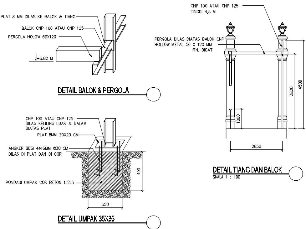 Theme park detail drawing of the pergola is given in this file. 8mm plated lashed is provided to the beam, and pole. 50x120mm pergola hollow is provided. For more details download the AutoCAD drawing file from our Cadbull website.
