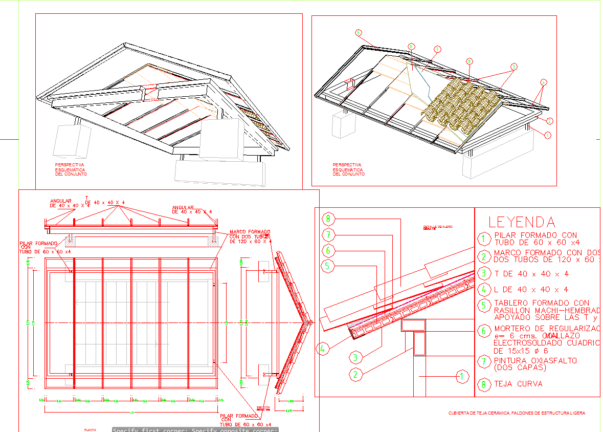 Roof sectional detail cad drawing includes isometric detail, elevation, plan and sections of slab roof.
