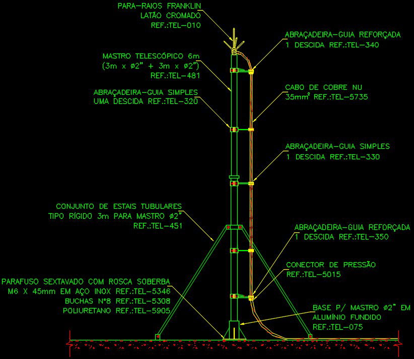 Franklin type lightning arrester in telescopic mast 6m and 1 descent detail drawing is given in this file. Franklin chrome brass lightning arrest, 6m telescopic mast, single guide clamp one descent, reinforced guide clamp, bare copper cable, simple guide clamp, reinforced guide clamp, set of rigid type tubular stains 3m for 2" mast , hexagonal screw with superb thread, pressure connector, base for mast ?2" in cast aluminum are mentioned. For more details download the AutoCAD drawing model.