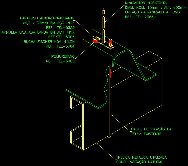 Installation of the 600mm mini captor using the fixing element of the fibro cement tile CAD drawing is given in this file. Horizontal mini captor, self-drilling screw, flat washer in stainless steel, fischer k54 nylon bushing, polyurethane, rod for fixing the existing roof, and metallic truck used as natural captures are mentioned. For more details download the AutoCAD drawing model.