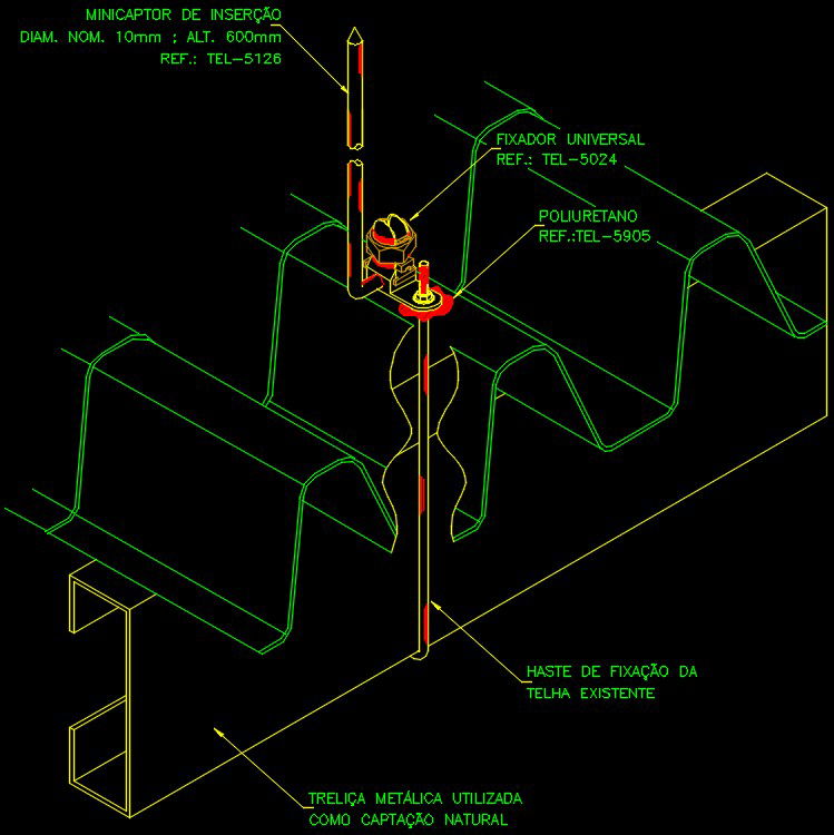 Fixing the insertion mini captor with the metallic truck through the existing tile fixing rod drawing is given in this file. Insertion mini captor, universal fixer, polyurethane, existing tile fixing rod,and metallic truss used as natural captures are mentioned. For more details download the AutoCAD drawing model.