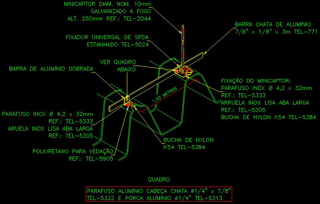 Fixing the aluminum flat bar vertically on the fibro cement tile detail drawing is given in this file. 10mm Diameter mini captor, fire galvanized, universal spda fixer, folded aluminum bar, aluminum flat bar, mini captor fixing, stainless screw ø 4.2 x 32mm, polyurethane for sealing, and other details are mentioned. For more details download the AutoCAD drawing model.