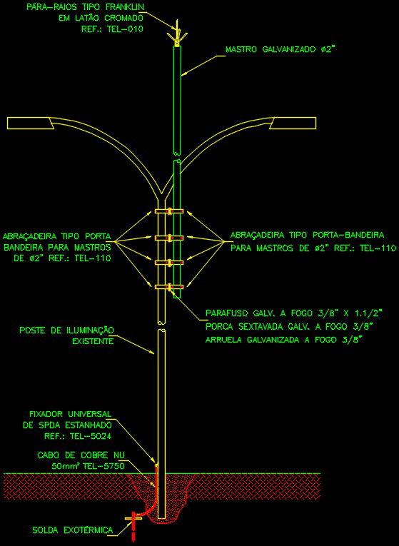 Generic detail of the installation of the flag bearing mast on a light pole drawing is given in this file. Chrome brass franklin type lightning arrest, galvanized mast ?2", flag holder clamp for masts, flag holder clamp for 2" masts, existing light pole, tinned spda universal fixer, bare copper cable, and exothermic welding are mentioned. For more details download the AutoCAD drawing model.