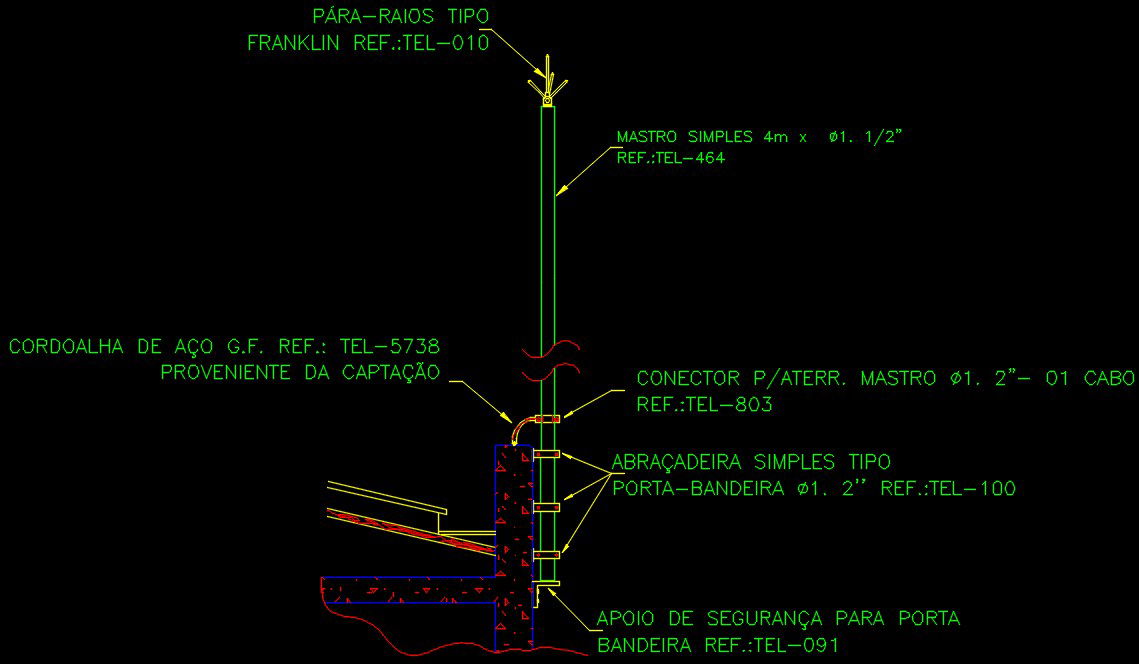Single mast 4m in flag holder type fixing detail drawing is given in this file. Franklin type sighting arrester, single mast 4m x 1. 1/2", steel string, from the catch, connector for grounding mast ?1. 2"- 01 cable, single clamp type, and safety support for doors are mentioned. For more details download the AutoCAD drawing model.