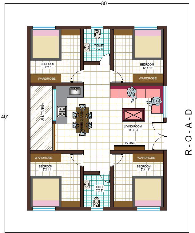 Autocad drawing file shows 40' x 30' 2bhk house plan. Ground floor layout plan Autocad drawing details that includes a detailed view main entry gate, main entry house door, living room with tv unit, utility area, L shape modular kitchen with dining area, 4 bedroom, 2 common bathroom, furniture details and much more of house floor plan. Thank you for downloading the 2d AutoCAD drawing file and other CAD program files from our website.