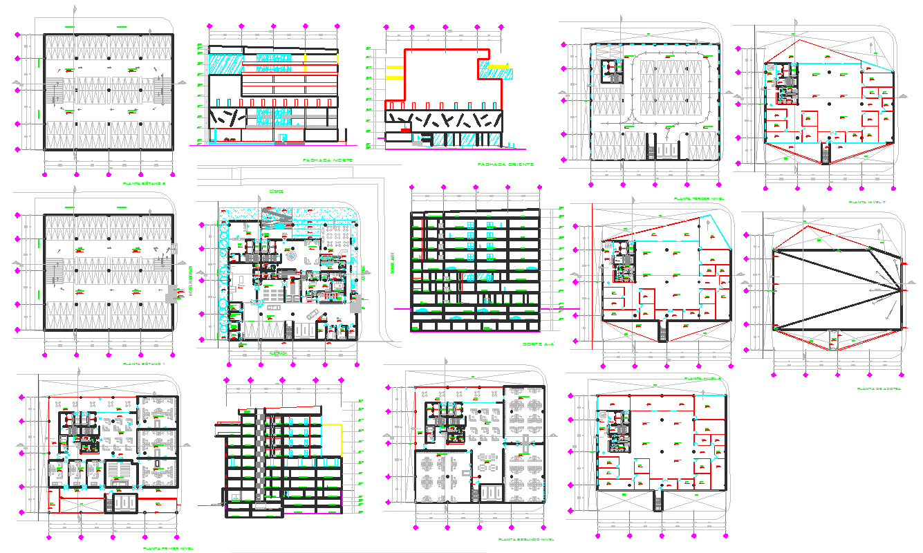 2300 Sq mtr multiple floor office building architecture plan in autocad dwg files. Include presentaions plan, working plan, sections, constructions detail, Hear all plan interiors plan design, Basement parking detail.