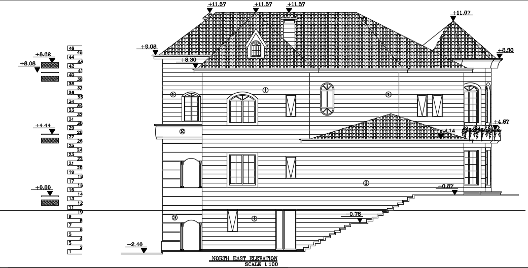 Northeast elevation view of the 16x16m luxury villa building is given in this file. This is G+1 building with basement floor. In this ground floor, veranda, breakfast dining, living room, kitchen, dining area, store room & laundry, common toilet, TV room, and master bedroom with the attached toilets are available. In the basement floor, living room, kitchen, boiler room, dressing room, and common bathrooms are available. In the first floor, living room, guest room with the attached toilet & bathtub, master bedroom with toilet & walk in closet, office room, kid’s room with the attached toilet & bathtub, and terrace are available. For more details download the AutoCAD drawing file from our website.