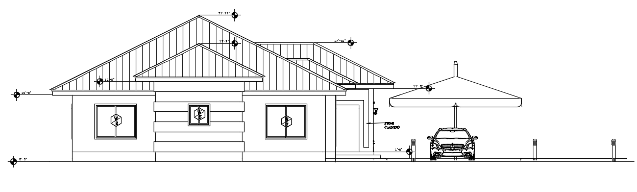 The right side elevation view of the 42’x45’ 2bhk house building drawing is given in this file. The total height of the building up to roof level is 10’. This is a single story building. This is a two bedroom house plan with furniture’s detail. In the entrance, entry porch is available. The living room, dining area, service porch, kitchen, pantry, hall, closet, master bedroom with the attached toilet, common bathroom, and kid’s rooms are available in this plan. For more details download the AutoCAD DWG drawing file from our cadbull website.