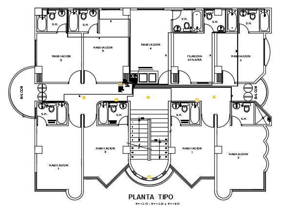 16x12m second floor hotel plan AutoCAD drawing is given in this file. Totally 8 rooms are available. Each room provided with the attached bathroom. Two balconies are available in this floor. For more details download the AutoCAD DWG drawing file from our cadbull website.