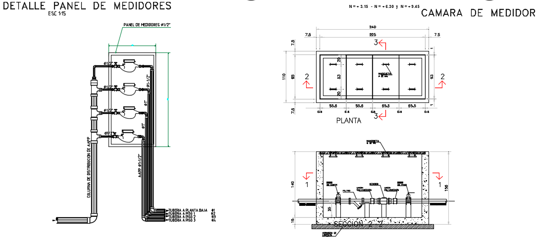 Meter panel detail drawing is given for 16x12m hotel building. ½” gauge panel is provided. Pipe line plan and it’s section detail drawing is given. For more details download the AutoCAD DWG drawing file from our cadbull website.