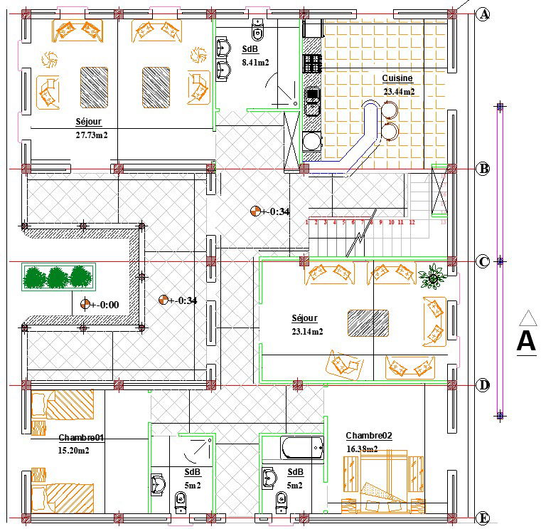 14x17m duplex first floor house plan CAD drawing is given in this file. This is G+ 1 house building. On this first floor, the living room, master bedroom with the attached bathroom, kid’s room with the attached bathroom, kitchen, and family room are available. For more details download the AutoCAD drawing file from our cadbull website.