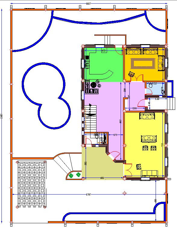 A residential site layout and plan of the 14x17m duplex house design ground floor is given in this CAD model. This is a G+ 1 house building. The staircase is provided inside of a home near the living room. On this ground floor, swimming pool, car porch, the living room, kitchen, master bedroom with the attaché toilet, kid’s room, guest room, parent’s room, and common bathroom are available. For more details download the AutoCAD drawing file from our cadbull website.