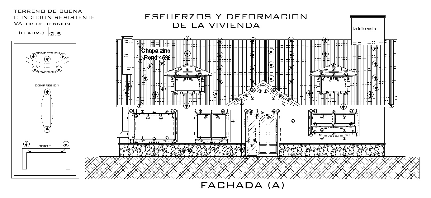 12x9m house building front stressed and deformation detail is given in this file. This is a 3bhk house plan. This is a single story residential building. This house consist of the living room, kitchen, dining area, master bedroom with the attached toilet, kid’s room, guest room, and common toilet are available. For more details download the AutoCAD drawing file from our cadbull website