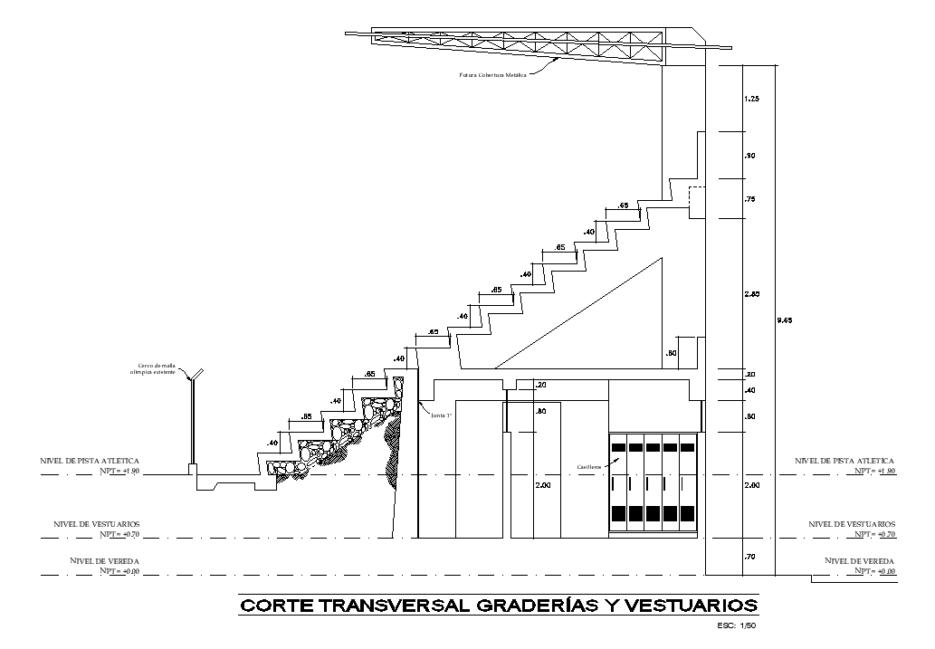 98x10m swimming pool dressing changing building staircase section is given in this model. The riser height is 0.4cm. The length of the thread is 0.65cm. For more details download the AutoCAD drawing file from our cadbull website