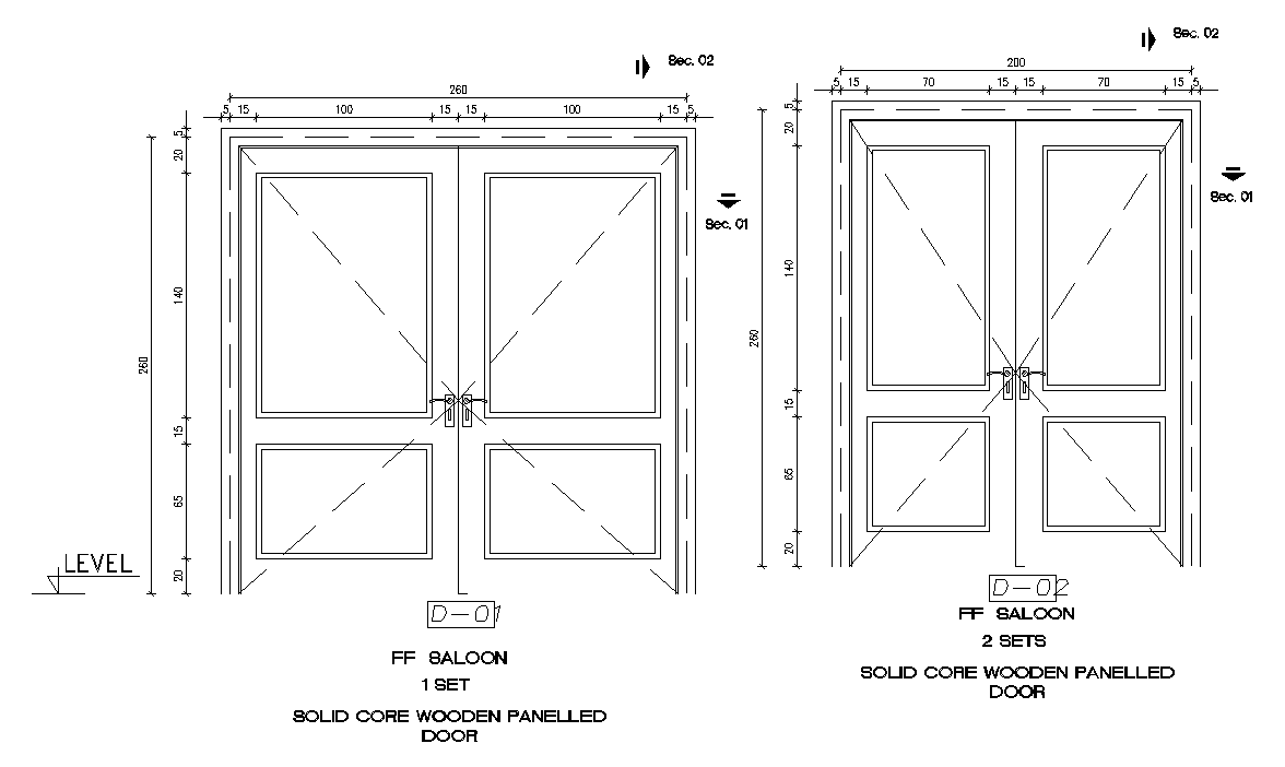 Solid core wooden paneled door AutoCAD drawing is given in this file. Two types of wooden paneled door plans are given. The dimension of the first door is 260x260cm. The dimension of the second door is 200x260mm. For more details download the AutoCAD drawing file. Thank you for downloading the AutoCAD drawing file in advance and other CAD program files from our website.