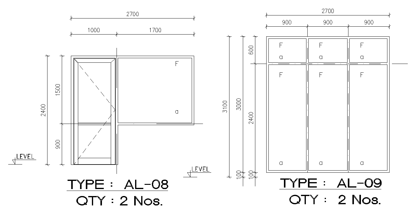 1000x2400mm door drawing is given in this AutoCAD file. The dimension of the second door plan 2700x3100mm. The height of the door is 2.4m and length of the door is 1m. Thank you for downloading the AutoCAD drawing file in advance and other CAD program files from our website.