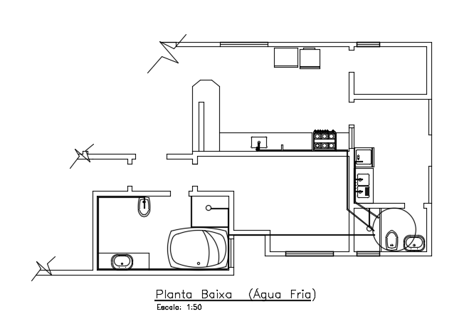 16x7m house plan cold water line CAD drawing is given in this file. The cold water lines are provided to the kitchen pipes, common bathrooms, and washbasins. For more details download the AutoCAD drawing model from our website.