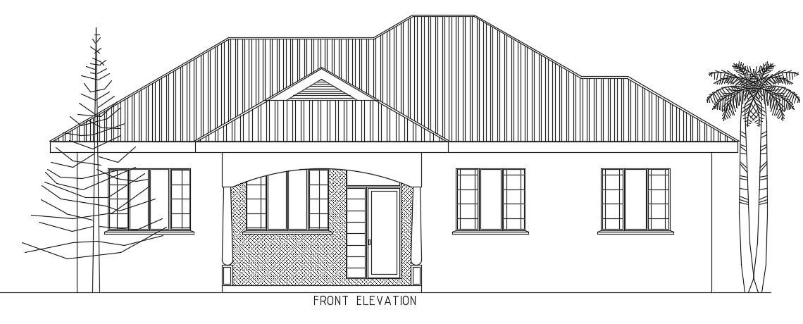 The front elevation view of the 15x14m residential building AutoCAD drawing is given in this file. The height of the building is 4.2m. The living room, veranda, dining area, corridor, master bedroom with the attached toilet, kid’s room, two guest room, and common bathrooms are available. For more details download the AutoCAD drawing model from our website.