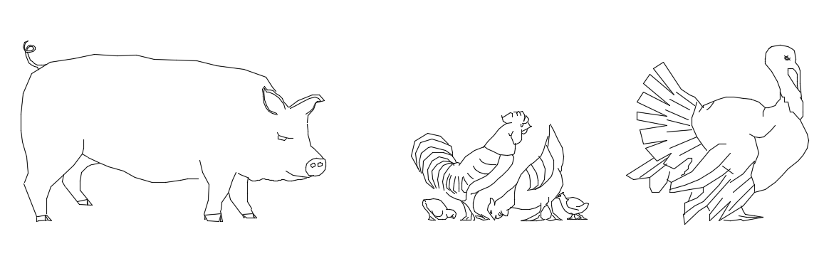 Domestic animal CAD drawing model is given in this file. The pig, hen, chicks, and duct plans are given. For more details download the AutoCAD drawing model from our website.