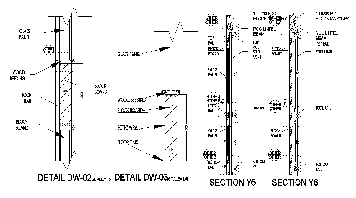 A section view of the door detail drawing is given in this file. Wood beeding, block board, bottom rail, floor finish, lock rail, glass panel, top rail, RCC lintel beam, and steel meshes are given. For more details download the AutoCAD drawing file. Thank you for downloading the AutoCAD drawing file and other CAD program files from our website.