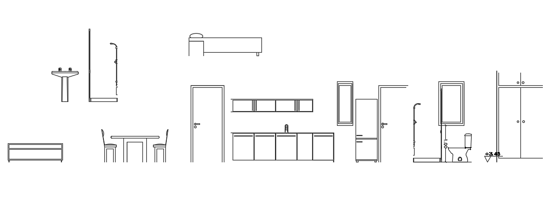 7x14m house plan of 2D furniture’s CAD drawing is given in this file. Cupboard, dining table, chairs, washbasin, water closet, bed cot, kitchen cupboard, fridge, and other details are mentioned. For more details download the AutoCAD drawing is given in this file.