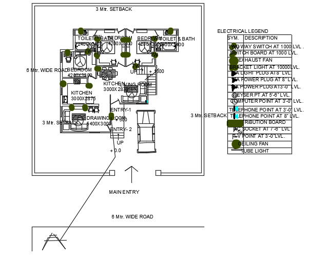 The electrical layout of the 14x12m home plan is given in this file. This is a ground floor house plan with 3bhk. This ground floor consists of the living room, car parking, drawing room, kitchen, dining, master bedroom with the attached toilet, kid’s room with the attached toilet, guest room, and balconies are available. For more details download the AutoCAD drawing is given in this file.
