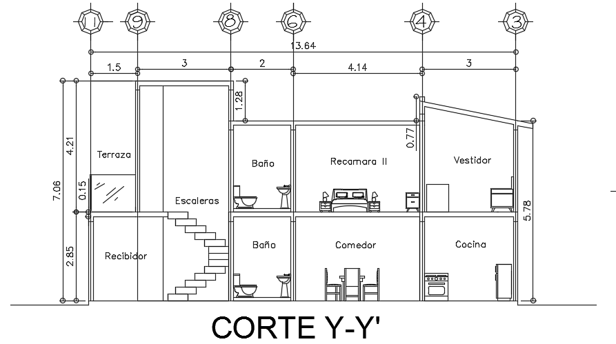The left side section view of the 10x22m house building is given in this file. This is G+ 1 house building. The garden, car parking, office room, living room, study room, kitchen, dining area, and outside sitting area are available on this ground floor. On this first floor, the living room, master bedroom with the attached toilet, two kid’s room, guest room, and common bathrooms are available. For more details download the AutoCAD drawing is given in this file.