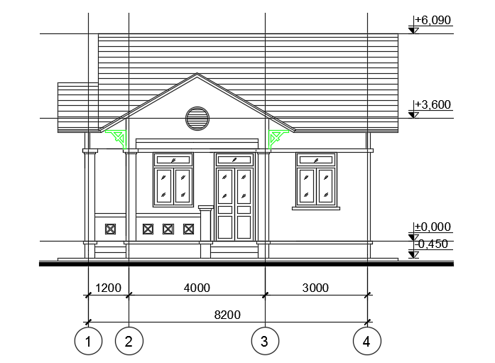 The front side elevation view of the 8x9m house building CAD drawing is given in this file. This is a single story house building. The height of the building up to roof level is 6.09m. The living room, kitchen, dining area, master bedroom, kid’s room, and common bathrooms are available. For more details download the AutoCAD drawing is given in this file.