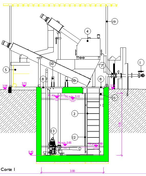 The left side cut section view of the 3x3m waste water treatment block is given in this model. Here, machine drawings are given. For more details download the AutoCAD drawing file from our website.