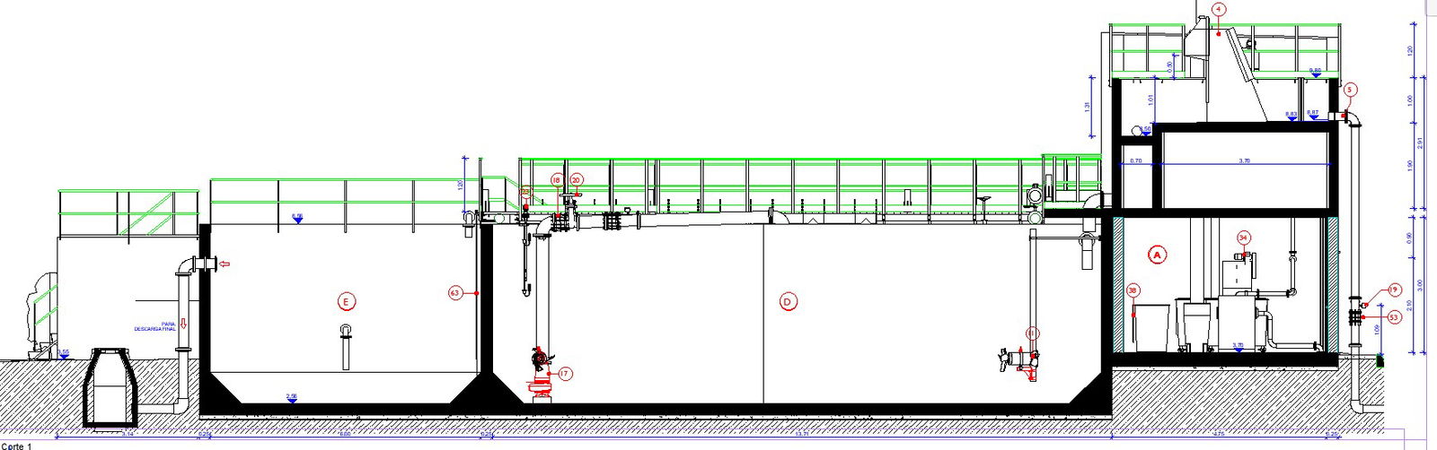 The left side section view of the water treatment plant is given in this CAD model. The section includes filtering process, pipe lines, machine drawings, and other details are mentioned. For more details download the AutoCAD drawing file from our website.