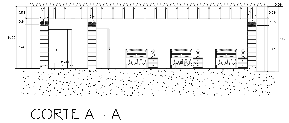 The front section view of the 10x6m bungalow building AutoCAD drawing is given in this file. This is single story bungalow building. On this ground floor, the living room, kitchen, dining area, master bedroom, kid’s room, and common bathrooms are available. On this first floor, the master bedroom with 3 beds, and common bathrooms are available. For more details download the AutoCAD drawing file from our cadbull website.