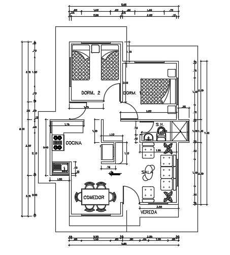 The furniture’s detail of the 6x8m architecture residential house plan AutoCAD drawing is given in this model. This is single story building. The living room, kitchen, dining area, master bedroom, kid’s room, and common bathrooms are available. For more details download the AutoCAD drawing file from our cadbull website.