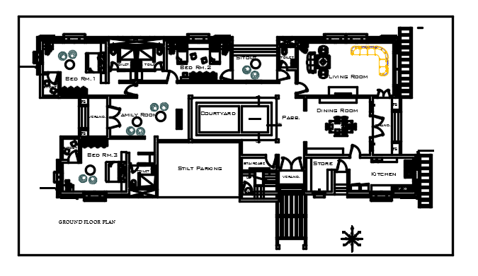 Furniture’s layout of the 34x15m ground floor house plan AutoCAD drawing is given in this file. The length and breadth of the house plan are 34m and 15m respectively. On this ground floor, the living room, car parking, kitchen, store room, dining room, master bedroom with the attached toilet, kid’s bedroom with the attached toilet, guest bedroom with the attached toilet, courtyard, passage, sit out, and gardens are available. For more details download the AutoCAD drawing file from our cadbull website.