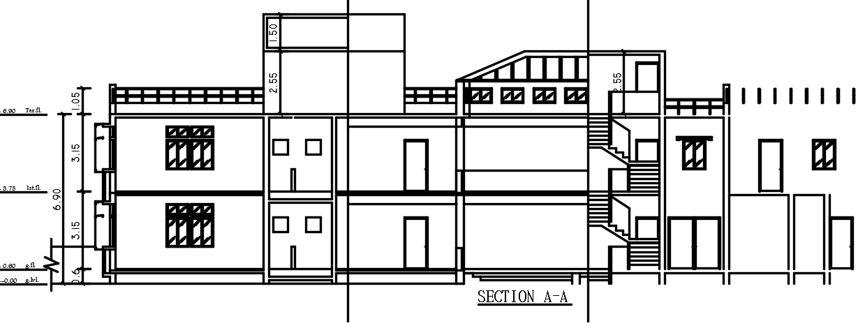 The right side section view of the 34x15m house building AutoCAD drawing is given. On this ground floor, the living room, car parking, kitchen, store room, dining room, master bedroom with the attached toilet, kid’s bedroom with the attached toilet, guest bedroom with the attached toilet, courtyard, passage, sit out, and gardens are available. On this first floor, the living room, master bedroom with the attached toilet, kid’s bedroom with the attached toilet, guest bedroom with the attached toilet, pergola, sit out, part terrace, terrace, family room, and gym with utility areas are available. For more details download the AutoCAD drawing file from our cadbull website.