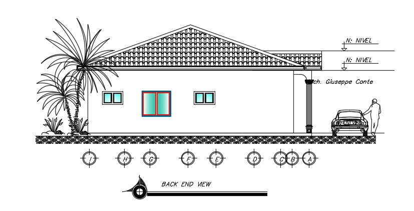 The back side elevation view of the 11x14m house building is given in this file. This is a single story house building. On this ground floor, the living room, dining area, kitchen, master bedroom with the attached toilet, two kid’s room, guest room, and veranda is available. For more details download the AutoCAD drawing file from our cadbull website.