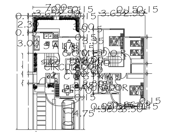 10x7m ground floor architecture house plan is given in this model. On this ground floor, the car parking, living room, dining area, kitchen, circulation area, patio service, garden, and common bathrooms are available. For more details download the AutoCAD drawing file from our website.