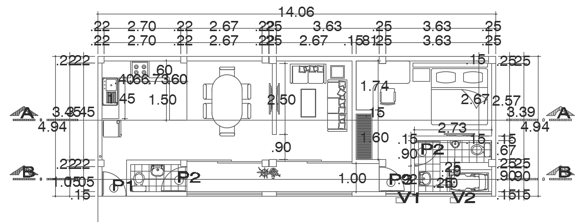 14x5m house plan I with single bedroom with attached bathroom CAD drawing is given in this file. The living room, master bedroom, kitchen, dining area, and common bathroom is available on this floor. For more details download the AutoCAD drawing file from our website.