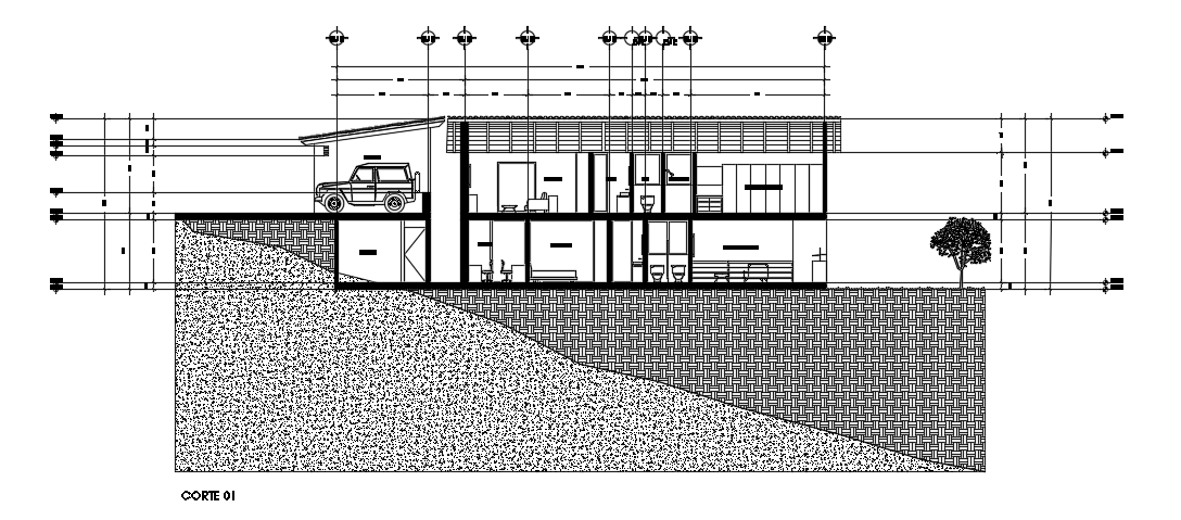 The left side cut section view of the 32x28 architecture house building AutoCAD drawing is given in this file. The living room, dining area, kitchen, master bedroom with the attached toilet, kid’s room, office room, and common bathrooms are available. The car parking, living room, master bedroom with the attached toilet, kid’s room with the attached toilet, guest room with the attached toilet, and common bathrooms are available on this ground floor. For more details download the AutoCAD drawing file from our website.