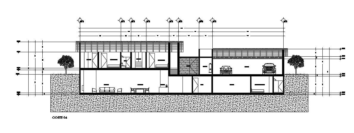 The back side section view of the 32x28 architecture house building AutoCAD drawing is given in this file. The living room, dining area, kitchen, master bedroom with the attached toilet, kid’s room, office room, and common bathrooms are available. The car parking, living room, master bedroom with the attached toilet, kid’s room with the attached toilet, guest room with the attached toilet, and common bathrooms are available on this ground floor. For more details download the AutoCAD drawing file from our website.
