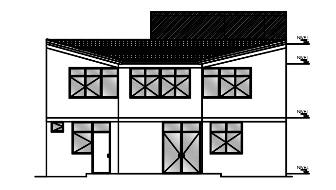 The front elevation view of the 12x19m house building AutoCAD drawing is given in this file. This is G+ 2 house building. The car parking, living room, hall, kitchen, dining area, master bedroom with the attached toilet, and common bathrooms are available on this ground floor. On this first floor, the living room, master bedroom with the attached toilet, kid’s room with the attached toilet, two guest room, and two common bathrooms are available. A detailed view of the house plan is given. For more details download the AutoCAD drawing file from our website.