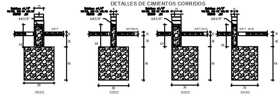 80cm and 70cm length of the foundation section view is given in this file. The height of the foundation is 0.90cm. There are four foundations given. For more details download the AutoCAD drawing file from our website.