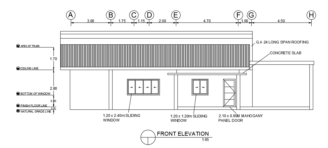 The front elevation of door and windows of the 18x13m house building AutoCAD model