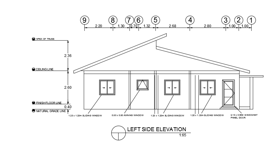 The left side elevation view of the 18x13m house building AutoCAD model is given in this file. This is a 3bhk house plan. On this plan, the living room, porch, garage, dining area, kitchen, master bedroom, with attached toilet & bathroom, kid’s room, guest room, storage room, and common bathrooms are available. For more details download the AutoCAD drawing file from our website.