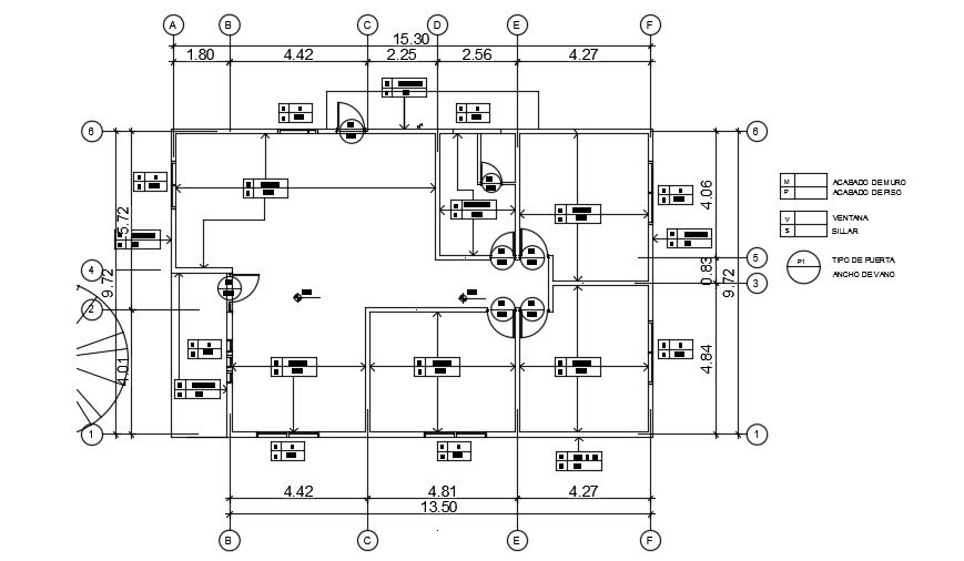 15x10m house plan door locations are given in this AutoCAD drawing. Each door is mentioned by the letter of P. For more details download the AutoCAD file from our cadbull website.