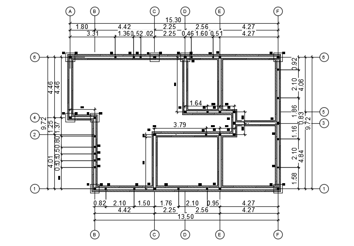 The column and foundation layout of the 15x10m house plan AutoCAD model